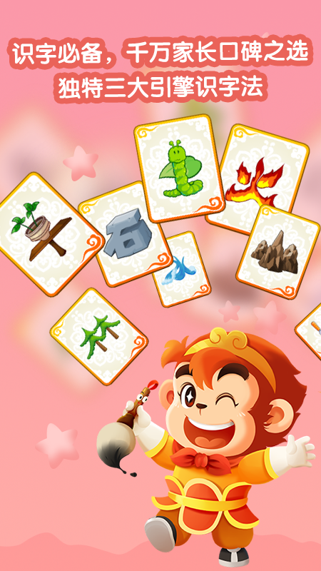 结合游戏的模式让孩子更加感兴趣。不单单是识字或者是,每天十几分钟的时间就能孩子学习新的汉字。将中国文化中的孙悟空作为孩子的启蒙老师,和孩子一起在游戏中认识字。