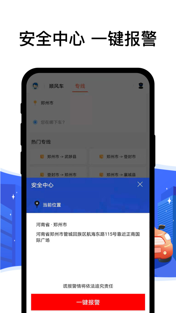 这里支持各种顺路接单,随时减少同行乘客的成本,操作十分简单,能让兼职的司机师傅,轻轻松松的赚取额外佣金哦,还有爽约赔付,安全第一,无需转车等一系列功能,一键报警,求助,定位,保障用户乘客的安全,打造一个快捷、美好、方便的出行软件哦