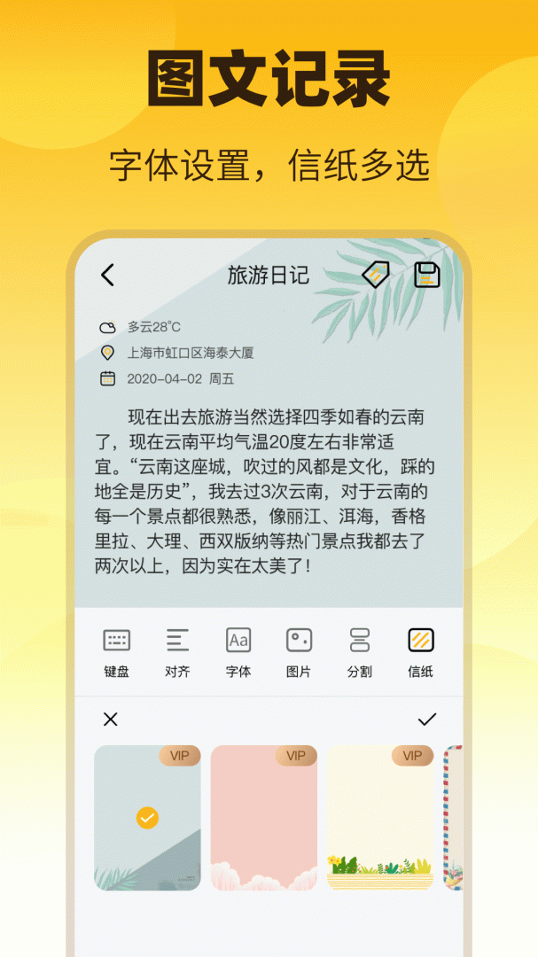 3、日记的背景图片可以自己来切换,你可以根据记录的内容来配上相应的图片;
