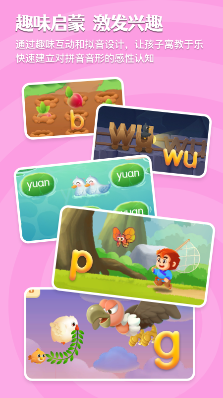 包含63个拼音专项练习,根据孩子进度提供智能练习,家长还能自定义定制专项。