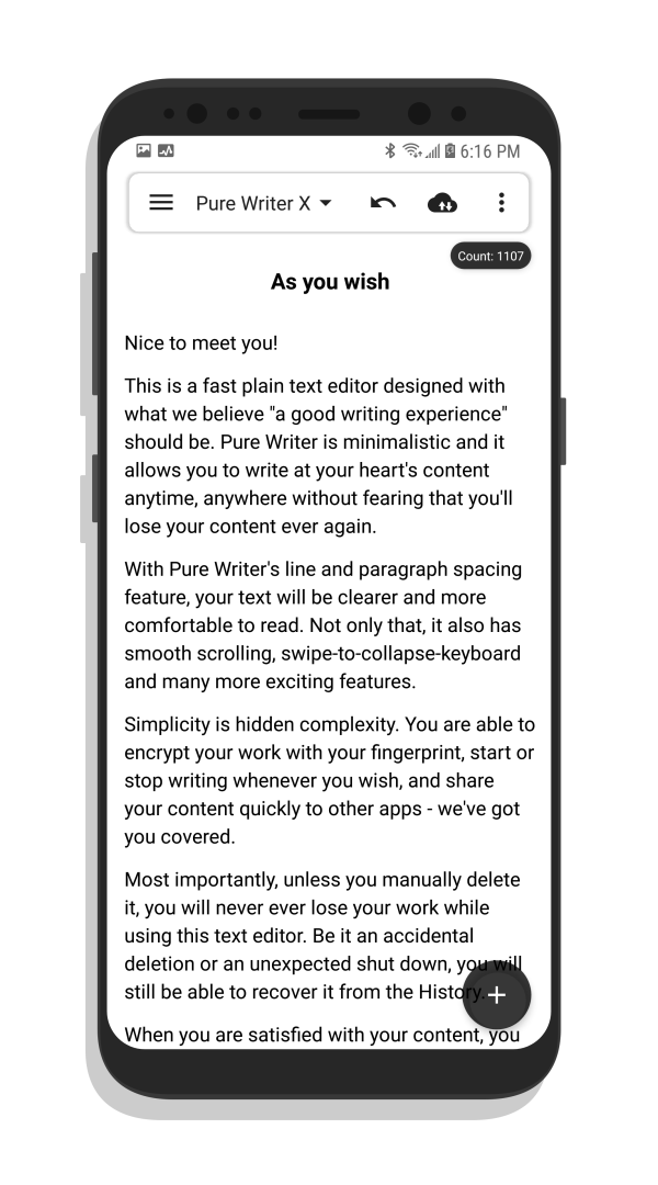 此款软件也是一款专业的文本编辑器功能,为您提供自动保存功能,指纹枷锁功能,简繁互换功能等等,纯纯写作是一款非常不错的手机端文本编辑器