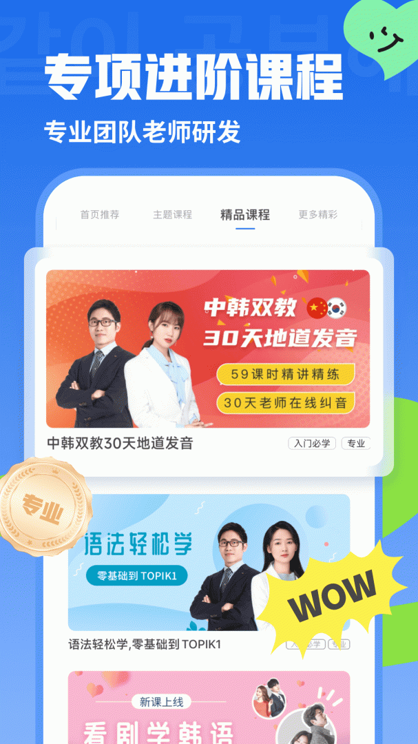韩语学习:应用中包含精选的韩语必备词汇和进阶词汇课程,用户可以通过词、句、对话的方式循序渐进地学习韩语,适合不同层次的学习者。