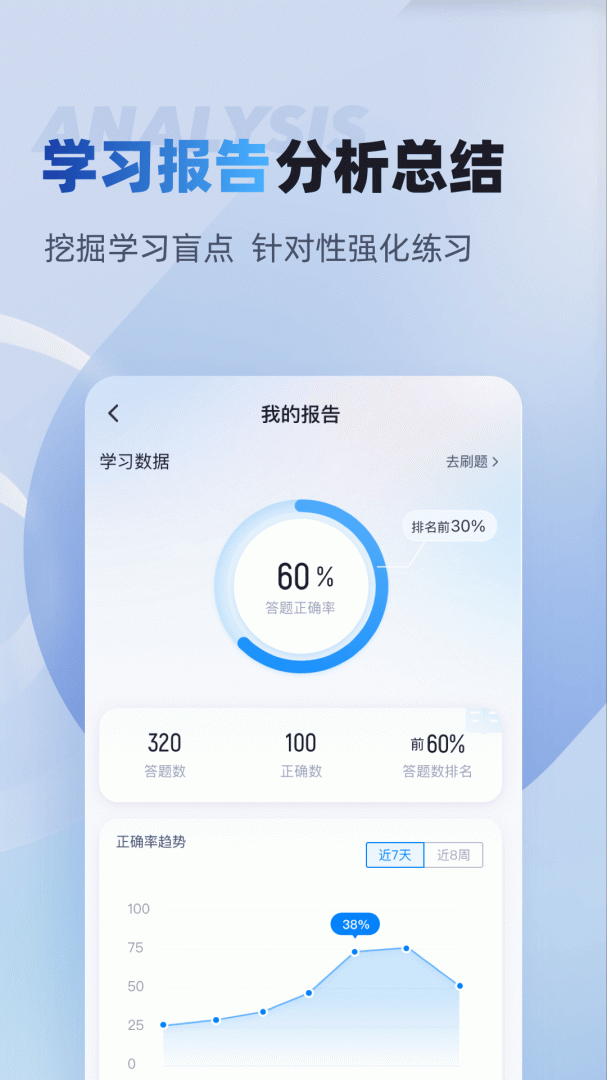软件会根据用户的做题、考试数据生成学习报告,助力用户查漏补缺。