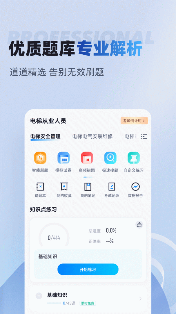电梯考试题库有模拟考场、历年真题练习、每日一练、快速练习、考点练习、考试押题、做题记录等多种学习与做题模式、丰富多样化的陪你一起考电梯证。