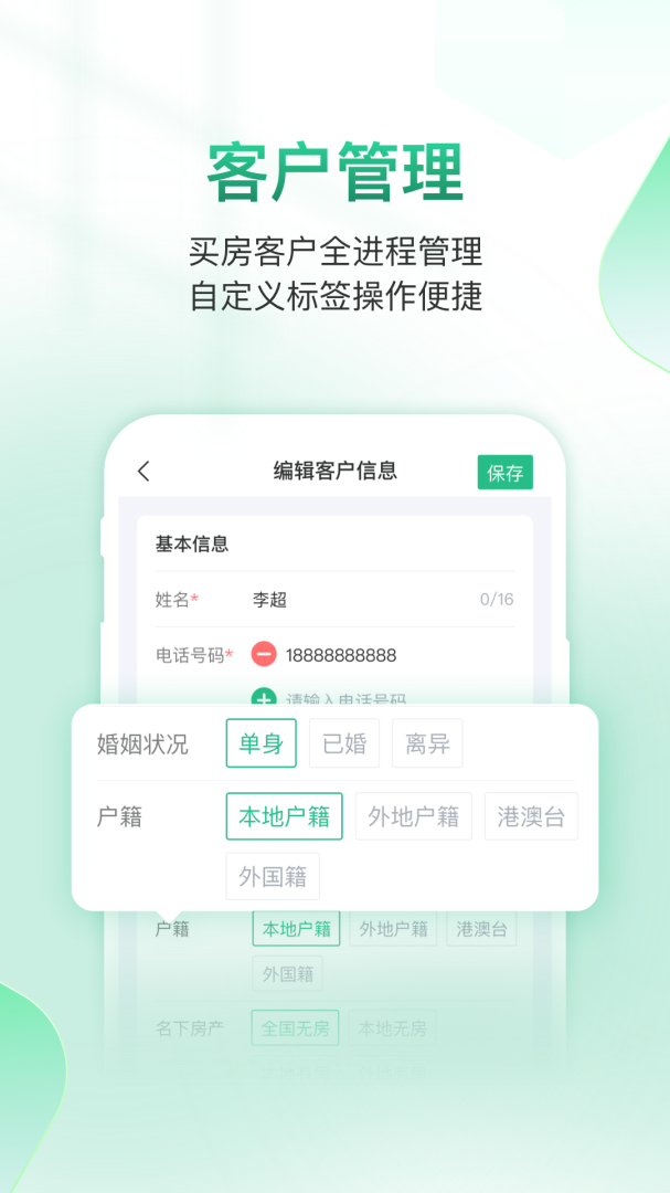 3、然后在“添加客户”界面填写好客户基本信息和带看信息后选择并点击右上角的“保存”选项即可完成报备客户的操作。