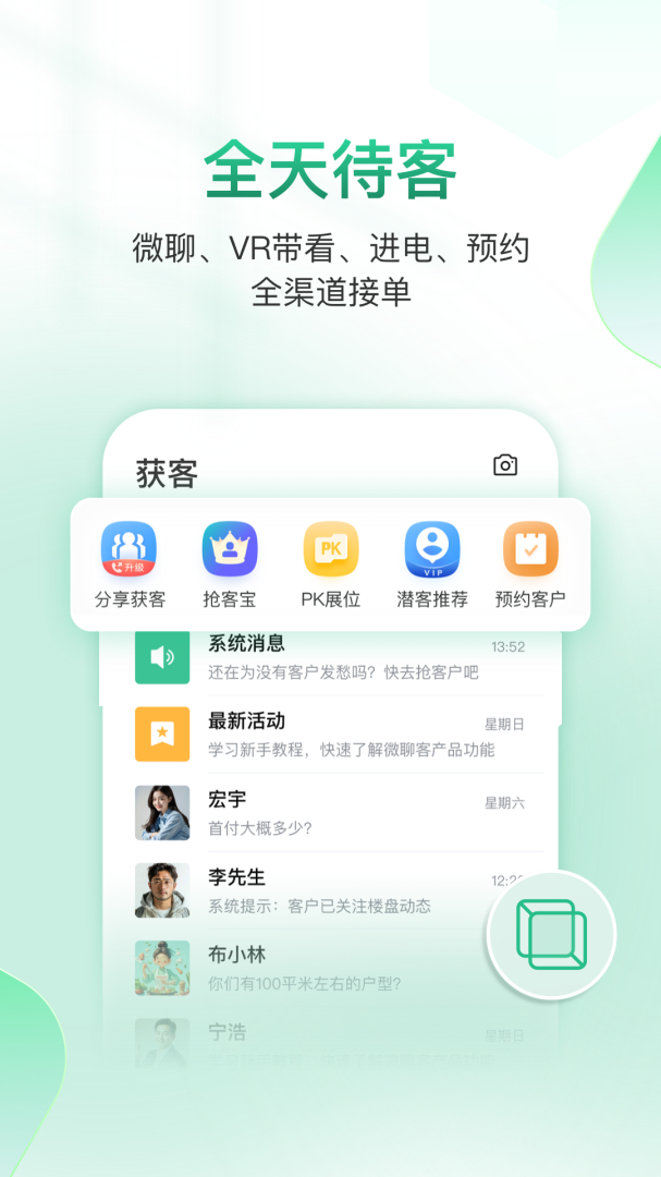 微聊客是专为房产经纪人定制的应用,由安居客集团打造,能随时和客户一对一电话交流,能随时展示优质房源给客户,更能把客户进行结构化,能大幅提高房产经纪人的业绩