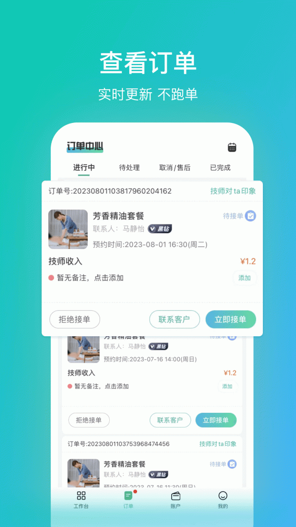 软件创新性地将订单管理、时间规划和客户沟通三大核心功能整合至统一平台。直观的操作界面让服务者能快速上手,而详尽的订单信息展示和智能提醒功能,保障了服务过程的专业性和连贯性。"简化操作但不简化功能"的设计理念,既满足了高效管理的需求,又保障了服务质量,堪称服务业者的数字化工作助手。