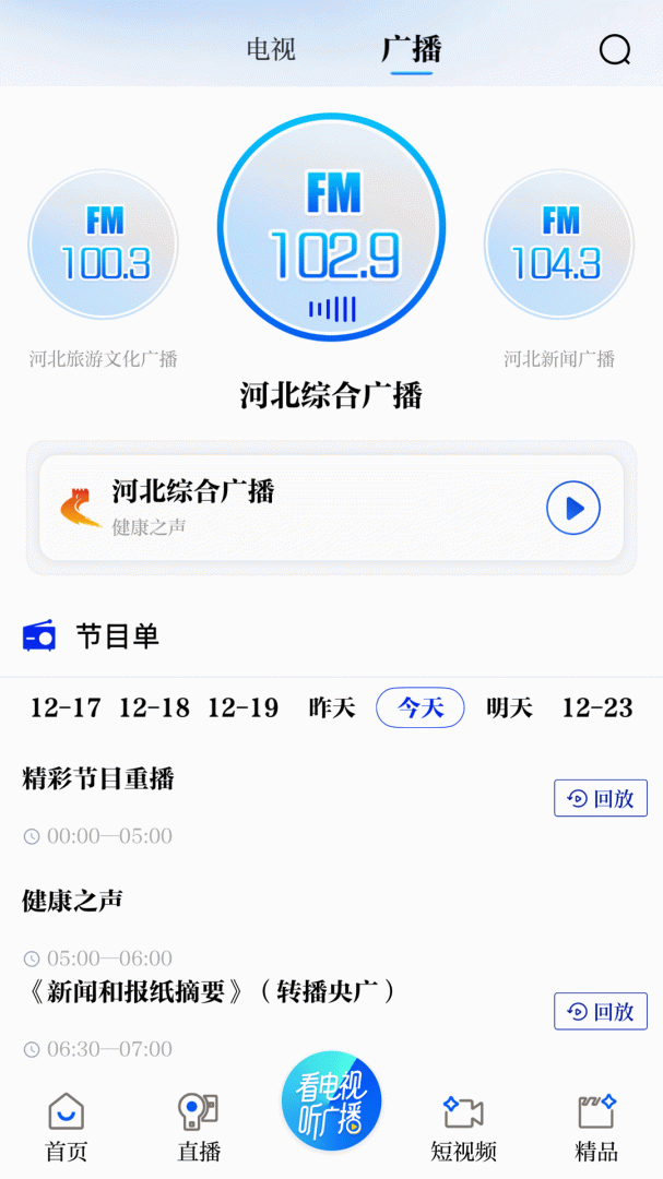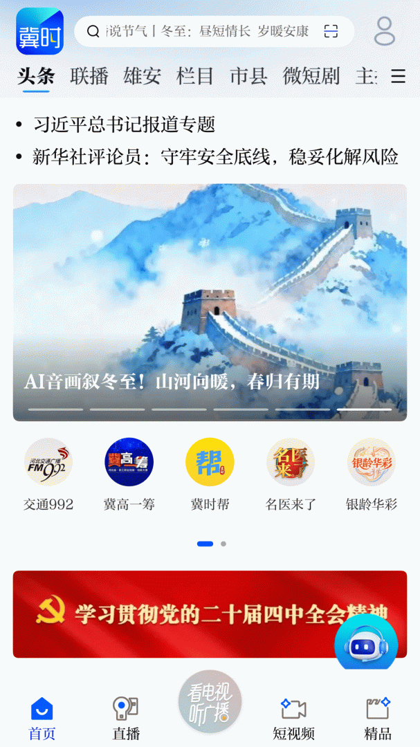 集成河北广播电视台全部9套广播频率与8套电视频道,支持直播与点播回看;同时提供重大事件现场直播,让用户随时随地“听广播、看电视、看直播”。
