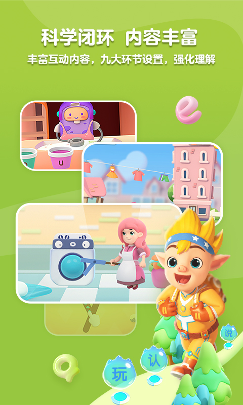 遵循部编版小学一年级语文教材的内容和教学目标,通过情景交互的方式设计课程,特别设置了玩、认、调、读、说、拼、练、写、测9大教学环节,让孩子能够关联记忆,实现高效学习。