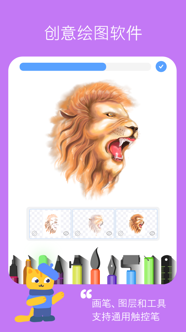 2、多样化工具提供铅笔、水彩、蜡笔、喷枪等20+绘画笔刷
