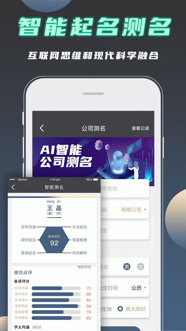 法人测名打分,提供综合点评、音律分析、生肖分析等功能。