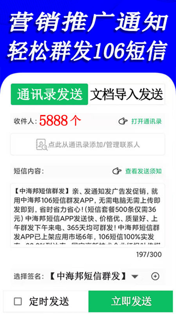 短信群发APP是一款专业高效的商务短信发送工具,专为商家、快递等需要批量通知的场景设计。支持从通讯录快速选择联系人,可一键发送数千条营销推广或客户关怀短信。采用106正规短信通道,送达率高达99.9%,移动联通电信全网覆盖。提供定时发送、模板管理、通讯录备份等实用功能,操作简单无需电脑。价格实惠,36元可发送500条短信,满足不同规模企业的群发需求。拥有工信部认证资质,保障短信发送的合法性和稳定性。