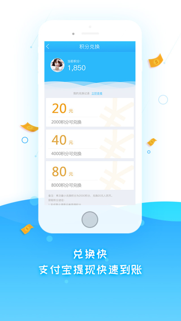 3、兑换快,当可兑换积分达到2000分时,就可以申请兑换现金啦!每周五统一审核兑换申请,并快速发放兑换款项;