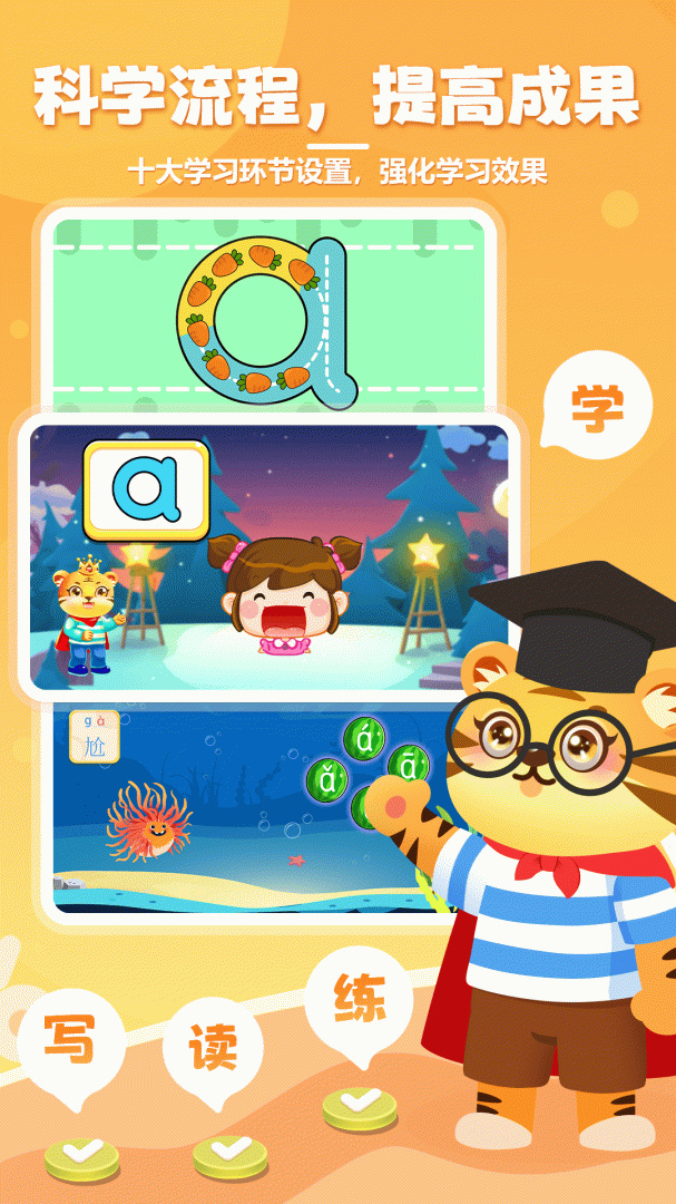专业播音员录制标准发音,孩子从小接触最纯正的拼音发音。