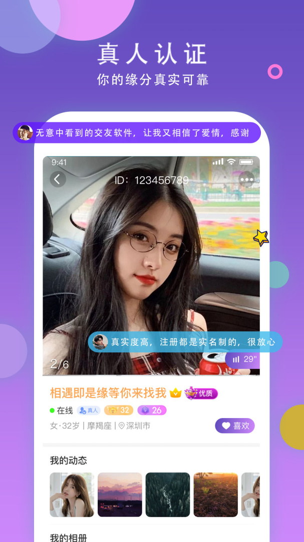 官方真人认证,杜绝机器人和不真诚行为,保障交友环境。