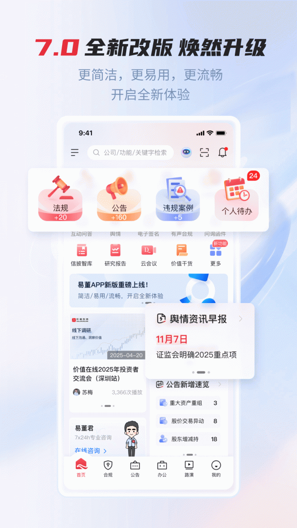 易董是一款专为上市公司打造的多功能软件,在投关和董办合规领域发挥关键作用。构建智能投研平台,凭借高效会议系统,实现上市公司、投资者和分析师之间的高效连接,推动投研工作与信息沟通。在董办办公方面,易董集成多种合规软件系统功能,从信息披露、三会运作,到投资关系管理等事务,均可高效完成。易董APP支持手机端便捷登录,搭配PC端,实现任务管理、会议管理、快速参会等功能在不同终端的完美融合,随时随地满足办公需求。智能投研平台通过路演活动,增进各方互动交流;高效会议系统配备白名单参会、电子签与承诺函等功能,保障安全参会。APP集成的合规管理软件,全面覆盖董办业务,助力实现董办事务的数字化升级。