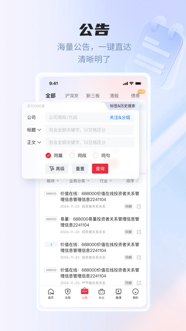 模糊记忆也不怕,关键字一键搜索所需公告,体验极速搜寻。