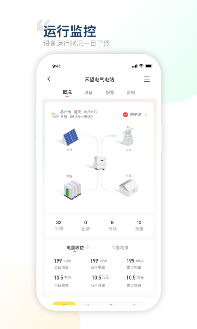 在这里可以从多方面采集数据,随时概览内容,包含了当日、当月、当年和累计总电量,可以查询实时功率、电站容量以及设备运行状态,可以一键报警,快速维护,即可安装使用
