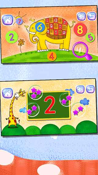 5、认数字——通过宝宝数学的数数,让宝宝数一数当前有多少只小动物,1-10的数量,每个小动物都是不同的数字,可让宝宝学数字的过程中不会感到枯燥,让宝宝学会数字的顺序,提高宝宝认知能力;