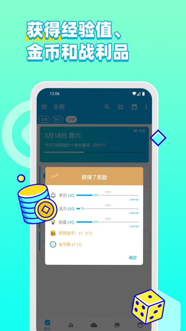 1、游戏化:你的人生会被量化成力量、学识、魅力、耐力、活力和创造力这六大属性,在完成待办事项的同时可以提高自己的属性的经验值和等级;