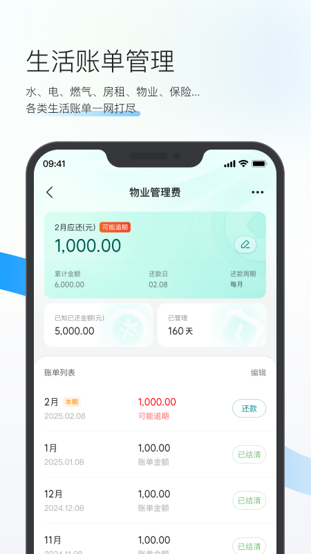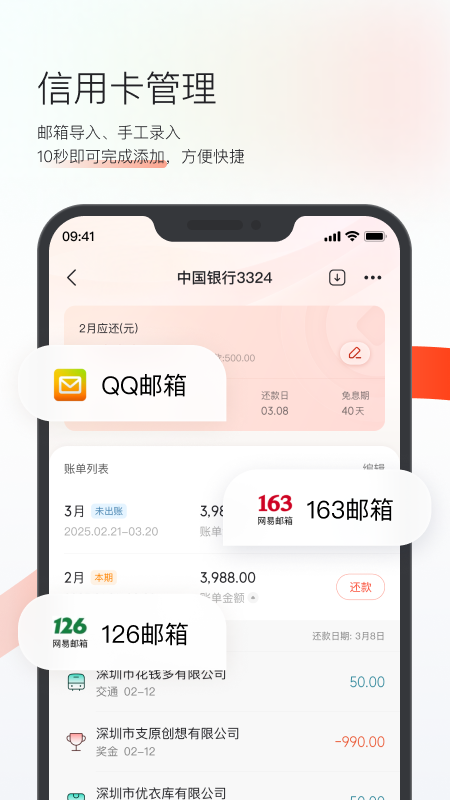支持淘宝花呗、京东白条、房贷、网贷等负债账单一键导入,管好债务,保护信用。