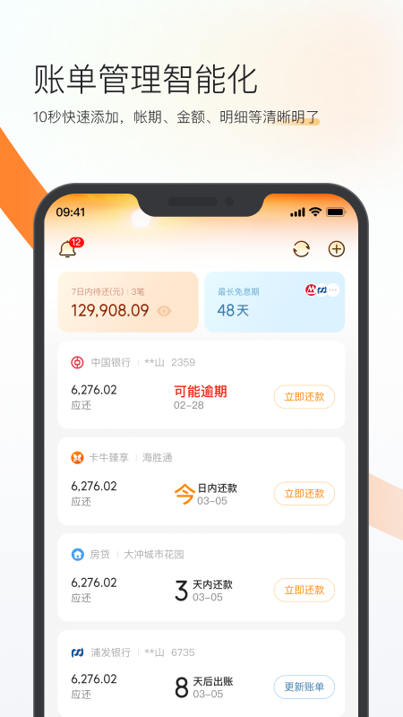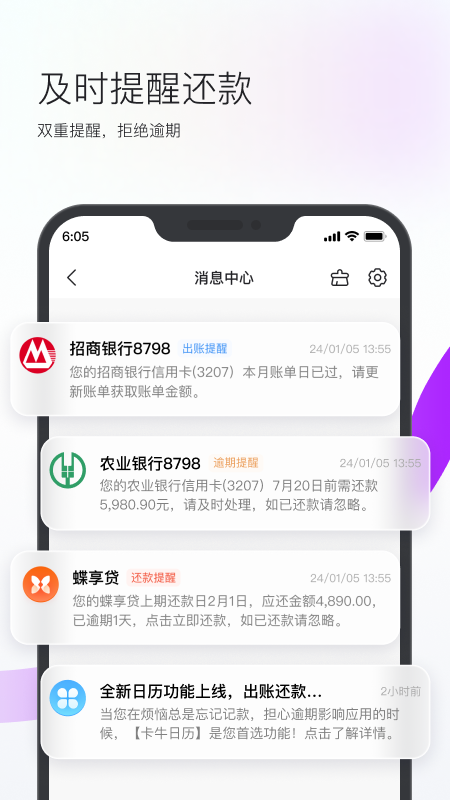 账单日、还款日、还款金额智能提醒,避免逾期被罚息。