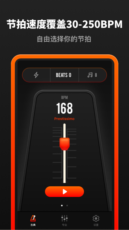 音乐节拍器根据所存储的音乐资源能自动分析出所有音符的节拍,特别适合玩音乐的专业人士使用,玩出新高度,艺术无极限