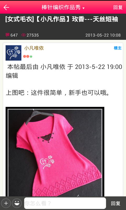 5、全网编织爱好者聚集,实时发帖分享个人编织技艺、交流编织心得。