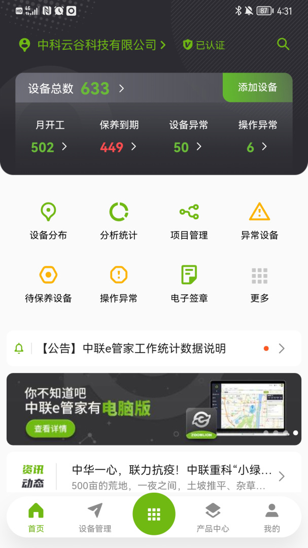 1、在首页可查看设备分布、统计分析、异常设备、签收管理等常用功能模块入口。