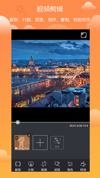 剪辑、编辑和合并视频,倒放,裁剪视频片段 从相册导入多段视频、图片,剪辑片段合辑 可以分享给朋友,随心所欲编辑视频特效。