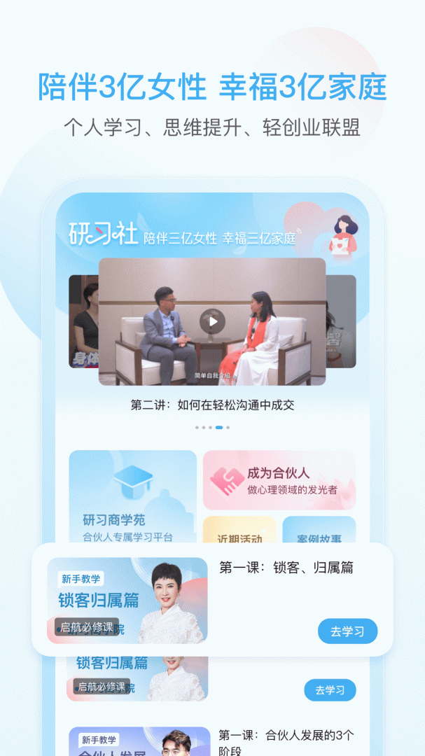 每日能量指引、女性赋能课、每周主题直播、海量有声书、大师课等课程免费学,还可参与线下工作坊、幸福研习活动、互动学习社群等。