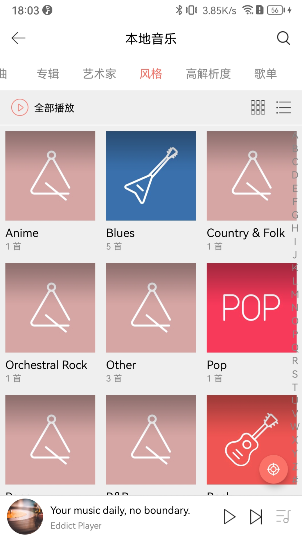 3、支持全部歌曲、文件夹、专辑、艺术家、风格分类,在歌曲浏览列表中可添加到播放队列、查看歌曲信息等