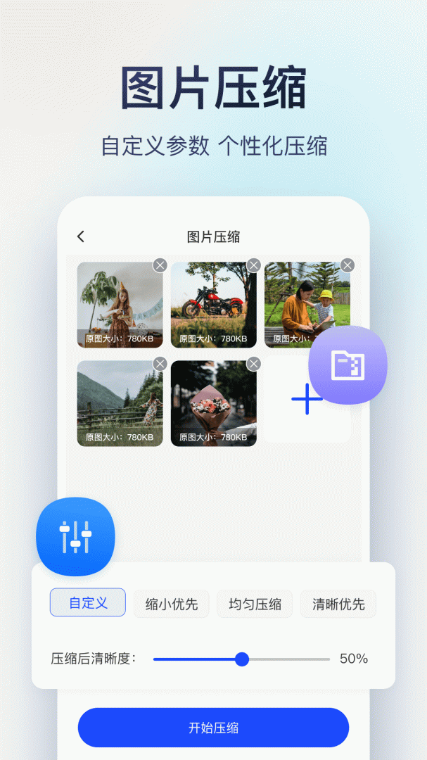 2、图片压缩:参数可自定义调整,批量个性化压缩,操作简便。