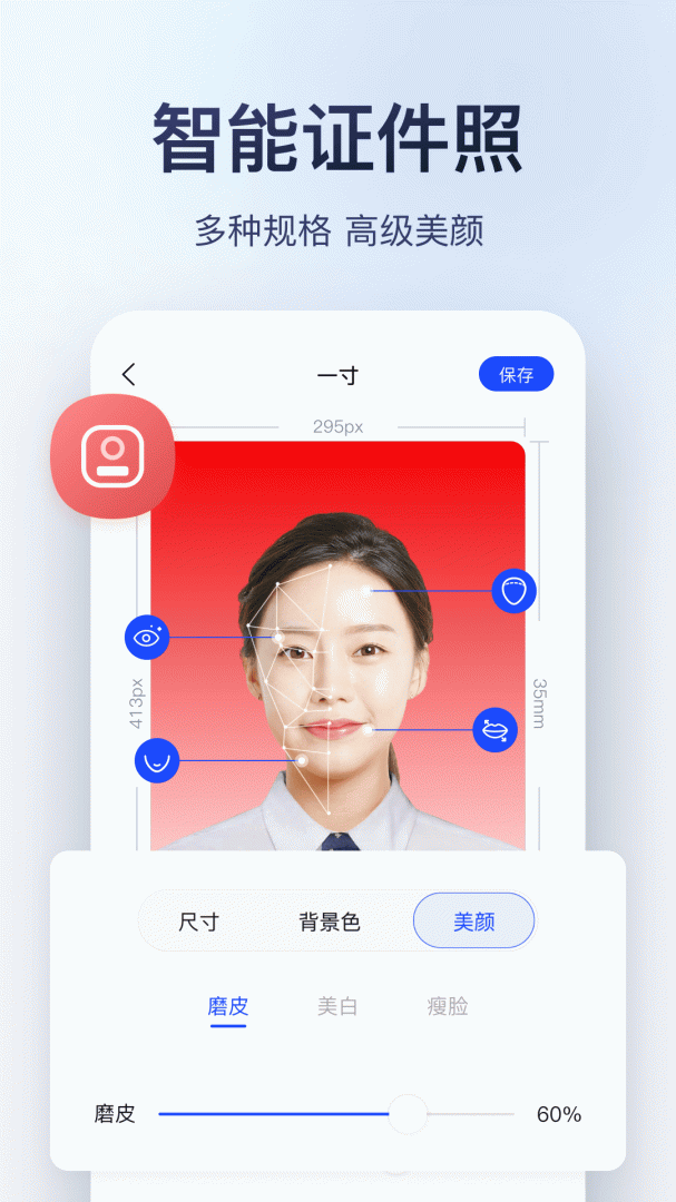 4、智能证件照:多种证件照规格可选,轻松更换底色或定制个性化证件照。