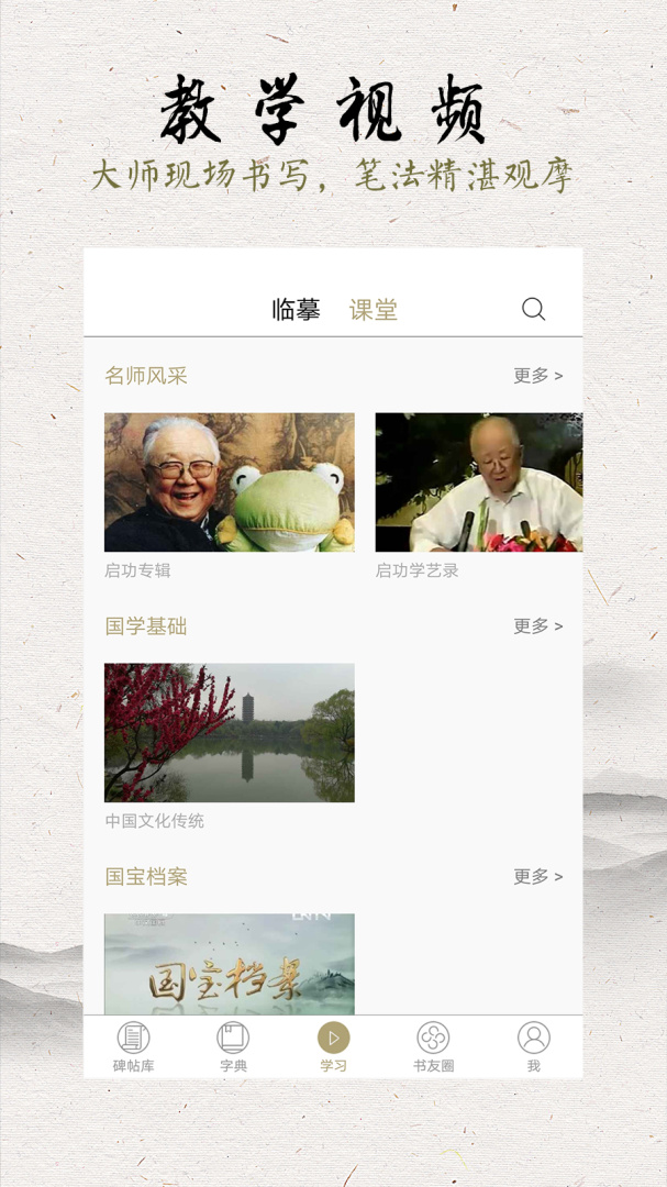 2、汇聚海量大师书法教学视频,传授书法技巧。