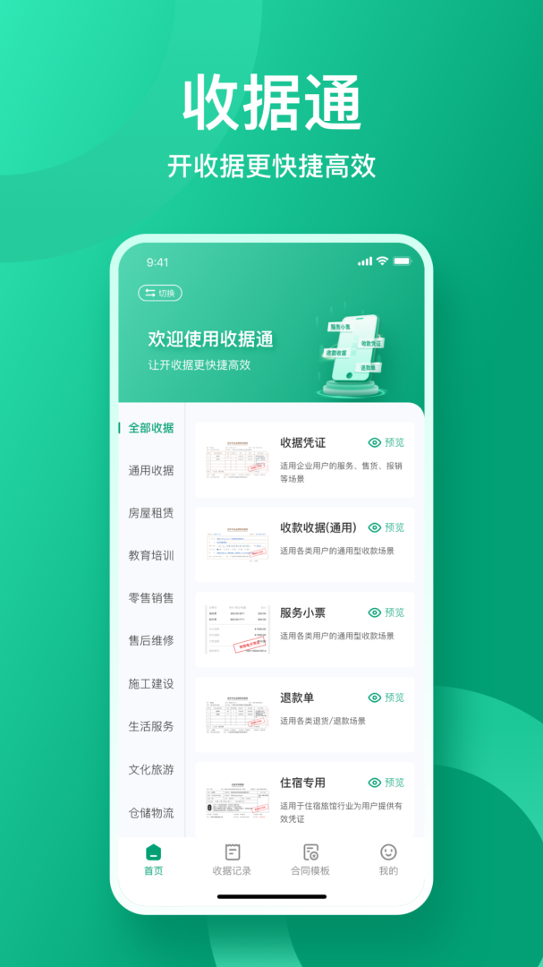 收据通专为提高开具收据的速度和效率而设计,用户能够快速生成符合需求的收据凭证,涵盖多种类型的收据和小票,如销售、租赁和服务等,满足不同业务场景的需求。