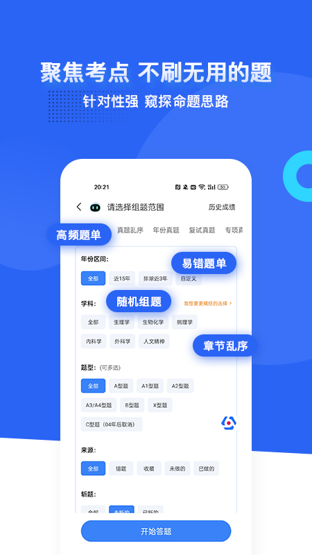 蓝基因覆盖三百多种医学考试,近33年真题一网打尽,从考研到执业资格证都能找到对应题库。每道题的切片式解析超详尽,连疑点难点都拆解得明明白白,能轻松摸透出题脉络。搭配章节练习和专项训练,刷题不再盲目,备考效率直接拉满!