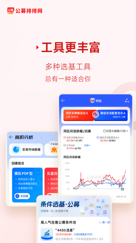 选基货比三家,同时对比一目了然,多维指标比对分析,选基不再烦恼。