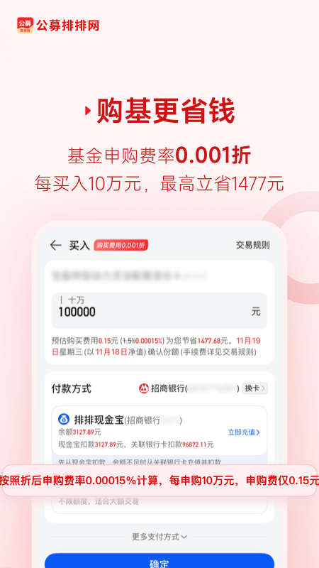 超低的公募基金申购费率可以让用户低价起购买入基金产品份额投资使用。