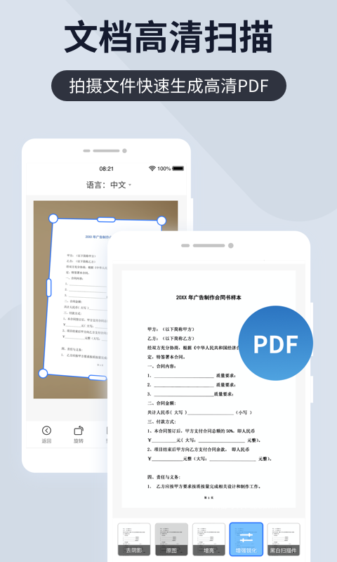 能够支持高清扫描单张文件、多张文件或书籍,快速生成pdf扫描件,并且用户还可以对扫描件进行色彩、亮度等调整,以获得更清晰、更符合需求的扫描效果,满足不同场景下的文件数字化需求。