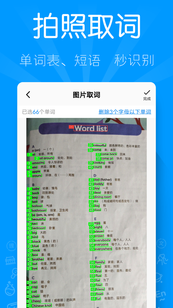 拍照取词和自动批改:用户可以通过手机拍照识别单词,软件会自动扫描出单词并生成语音播放进行听写。听写完成后,用户可以拍照上传单词表,AI会自动完成批改。