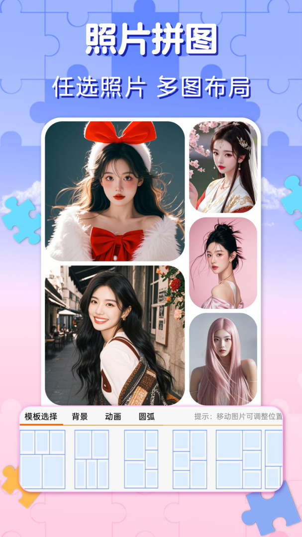照片拼图是一款简单易用的图片拼贴应用,提供海量时尚模板和创意素材,让你快速将多张照片组合成精美拼图。制作旅行回忆、生活记录还是社交分享,都能通过丰富的画框、贴纸、滤镜和文字工具,轻松表达你的独特风格,让每一张照片都成为视觉焦点!