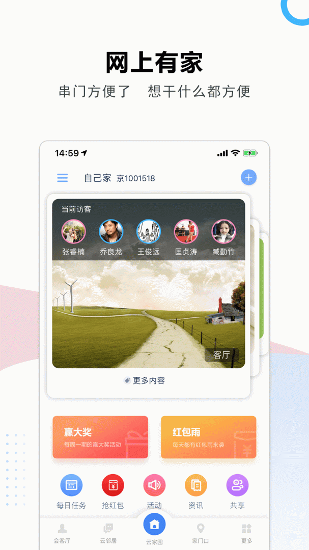 它为用户提供一个类似于真实家庭的在线社交平台。用户可以在这个平台上建立自己的“家”,邀请亲朋好友前来“串门”,分享生活点滴和互动交流。通过这个平台,用户可以实现各种生活需求的快速对接、资源共享和交易。