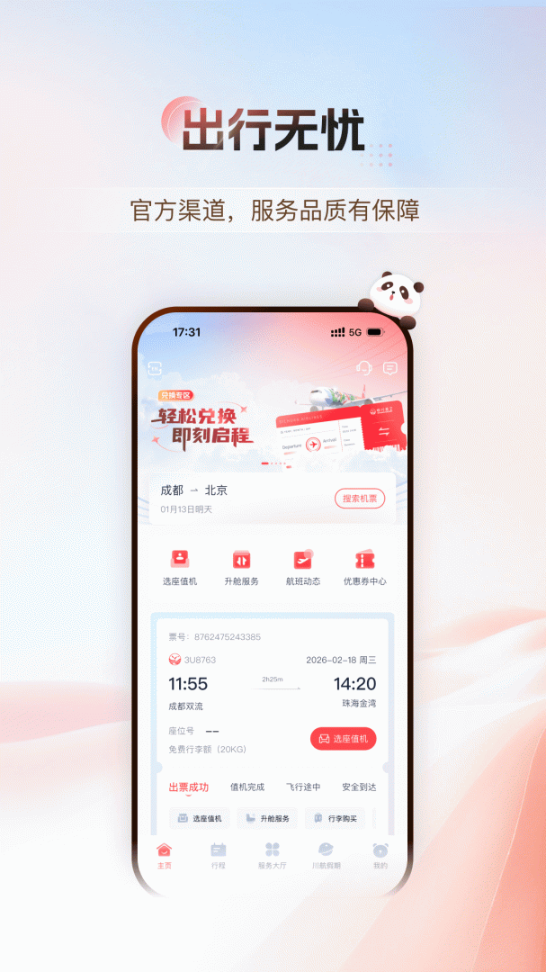 四川航空软件,这是官方推出的5.0,全新上线。会员可以更加节省,查询快速,随意飞哦,四川用户的必备