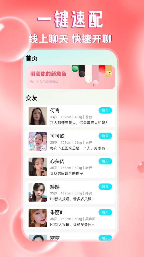 -采用智能算法,根据用户的兴趣、年龄、性别、地理位置等信息,快速匹配合适的交友对象,提高交友效率。