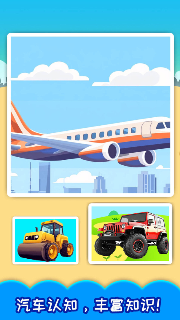 3、多种玩法,包括汽车拖拖乐,汽车拼图,可以使宝宝识别几十种交通工具