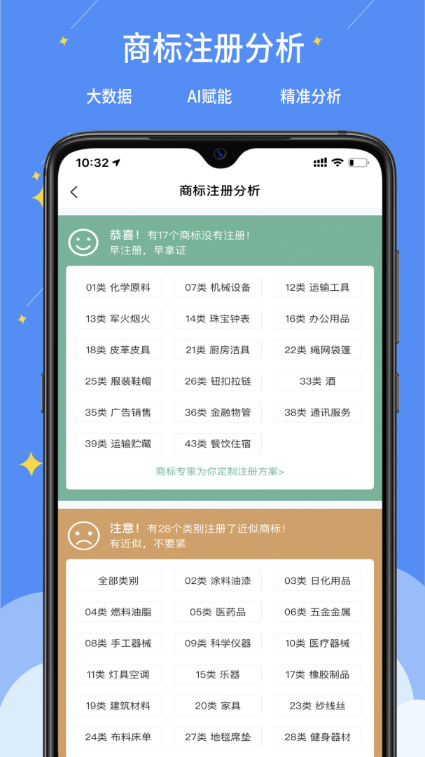 3、商标智能查询,商标近似查询提高商标相同查询、精准查询,精准筛选。商标小类查询,商标交叉分类查询,商标近似警告,商标注册风险评估,商标注册查询提示。