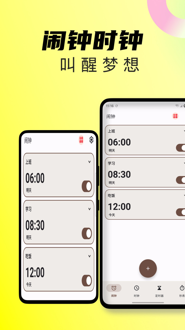 起床闹钟,顾名思义就是帮助叫起床的手机闹钟服务软件,用户可以这里设置多个的闹钟,这样可以帮助用户更好的安排处理自己每天的事情,不会因为睡过头而拖沓,平台上面还可以进行多彩壁纸、时间管家等超多功能,起床闹钟,赶紧关掉闹钟起床了