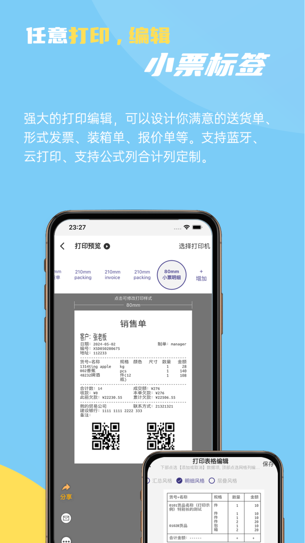 7. 单据打印支持双表格打印,支持上下网格分离打印