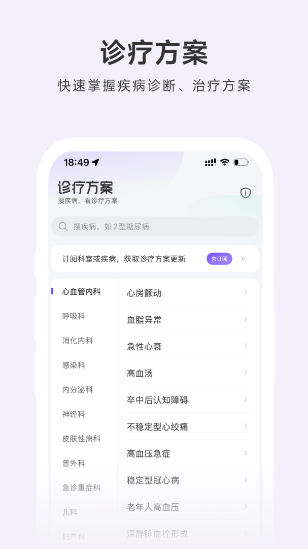 诊疗顾问:提供数千条临床常见疾病的诊疗决策支持,覆盖诊断依据、治疗原则等核心诊疗环节,并查询疾病的经典用药信息。